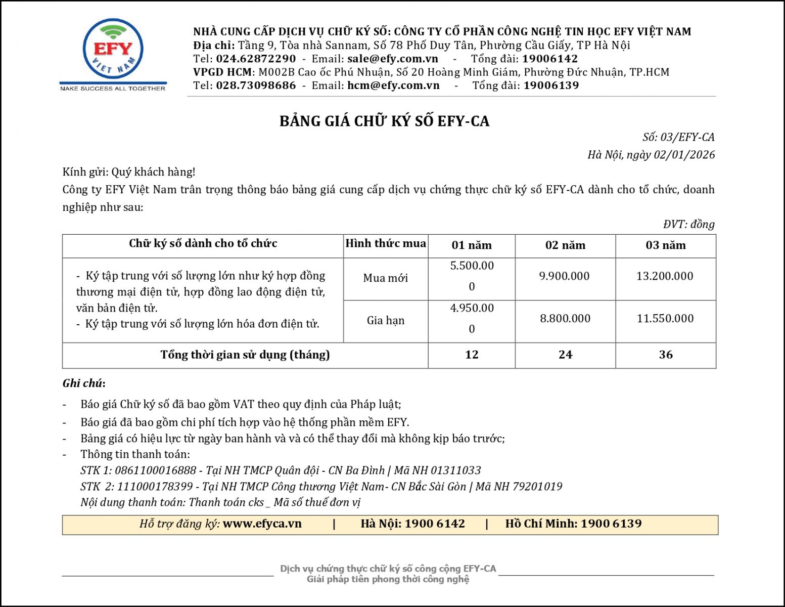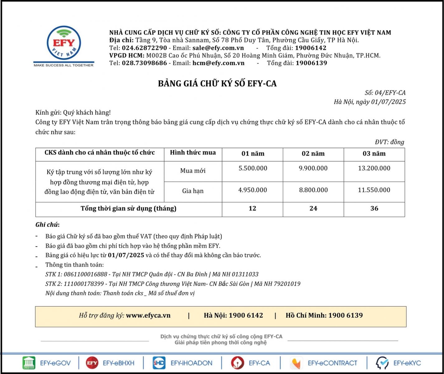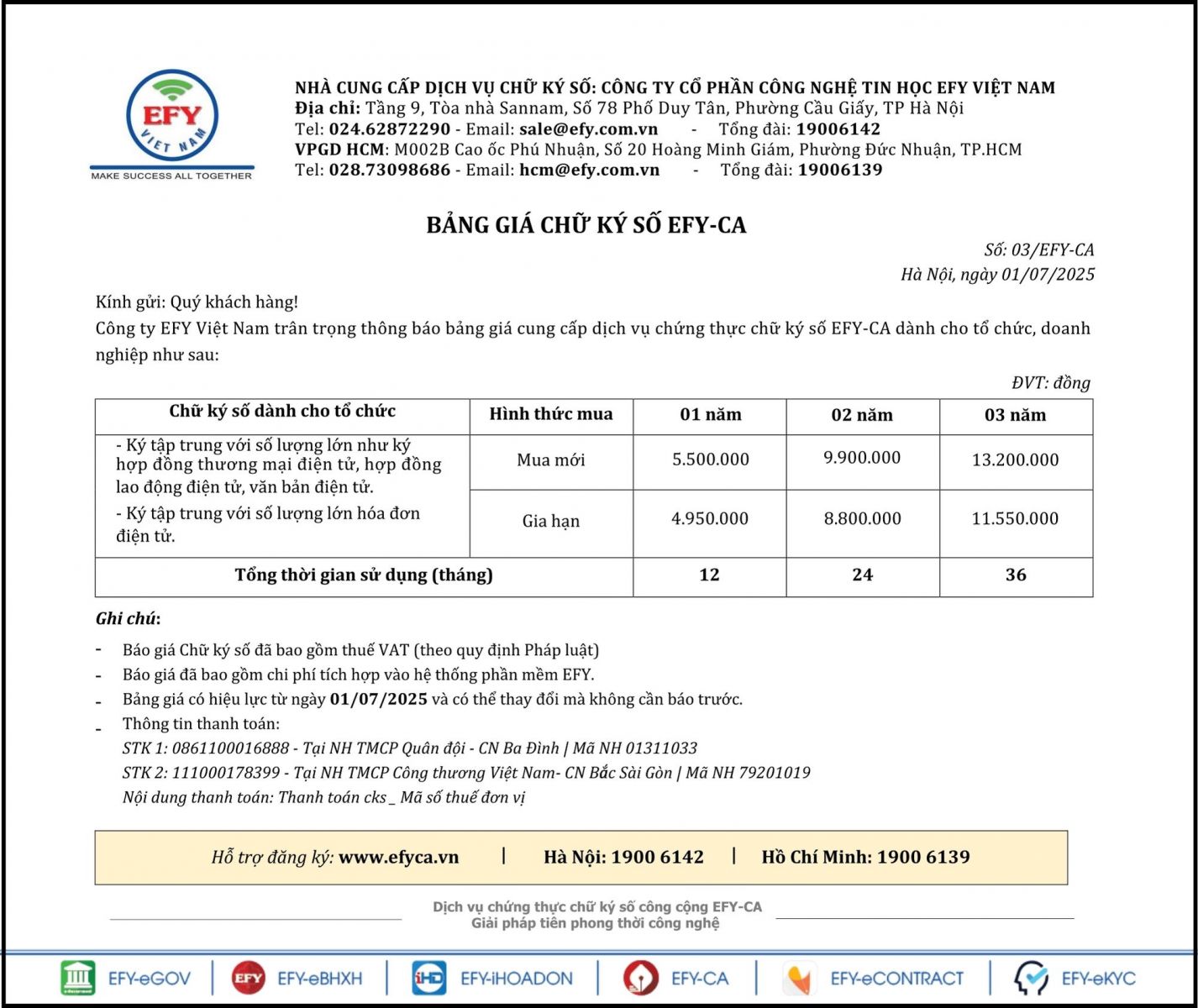 EFY Việt Nam trân trọng thông báo tới Quý khách hàng bảng giá các loại chữ ký số EFY-CA sau đây: