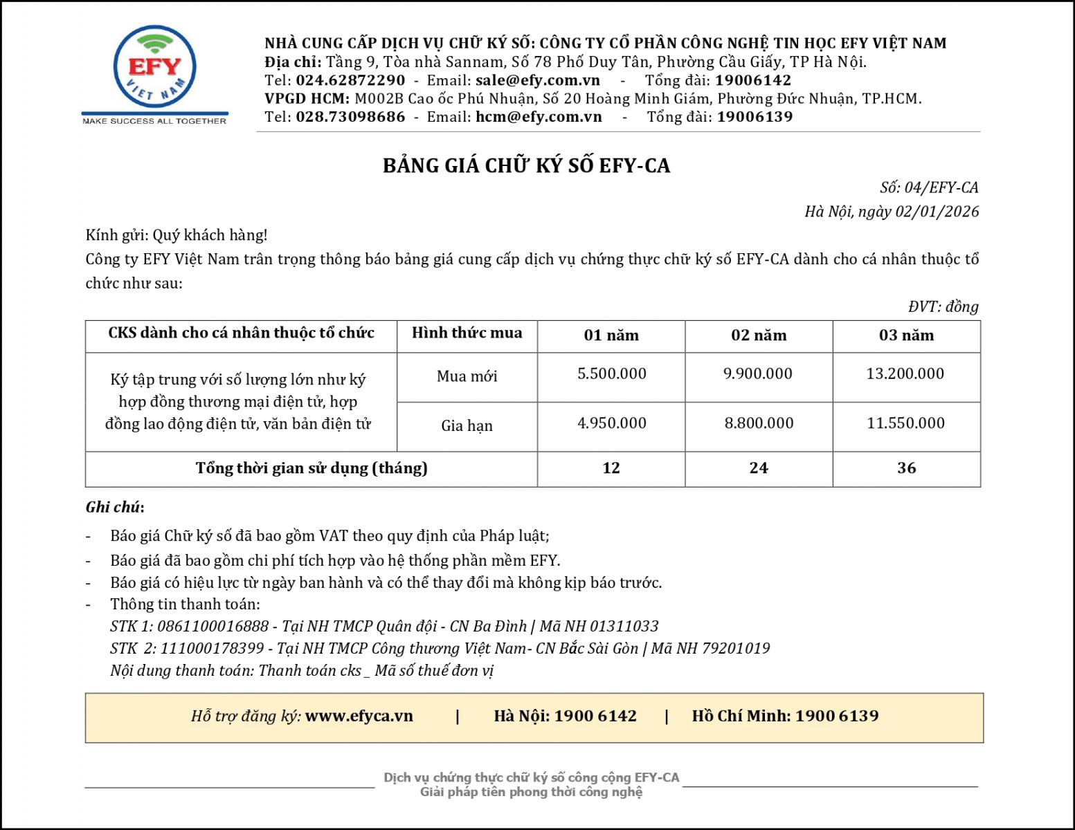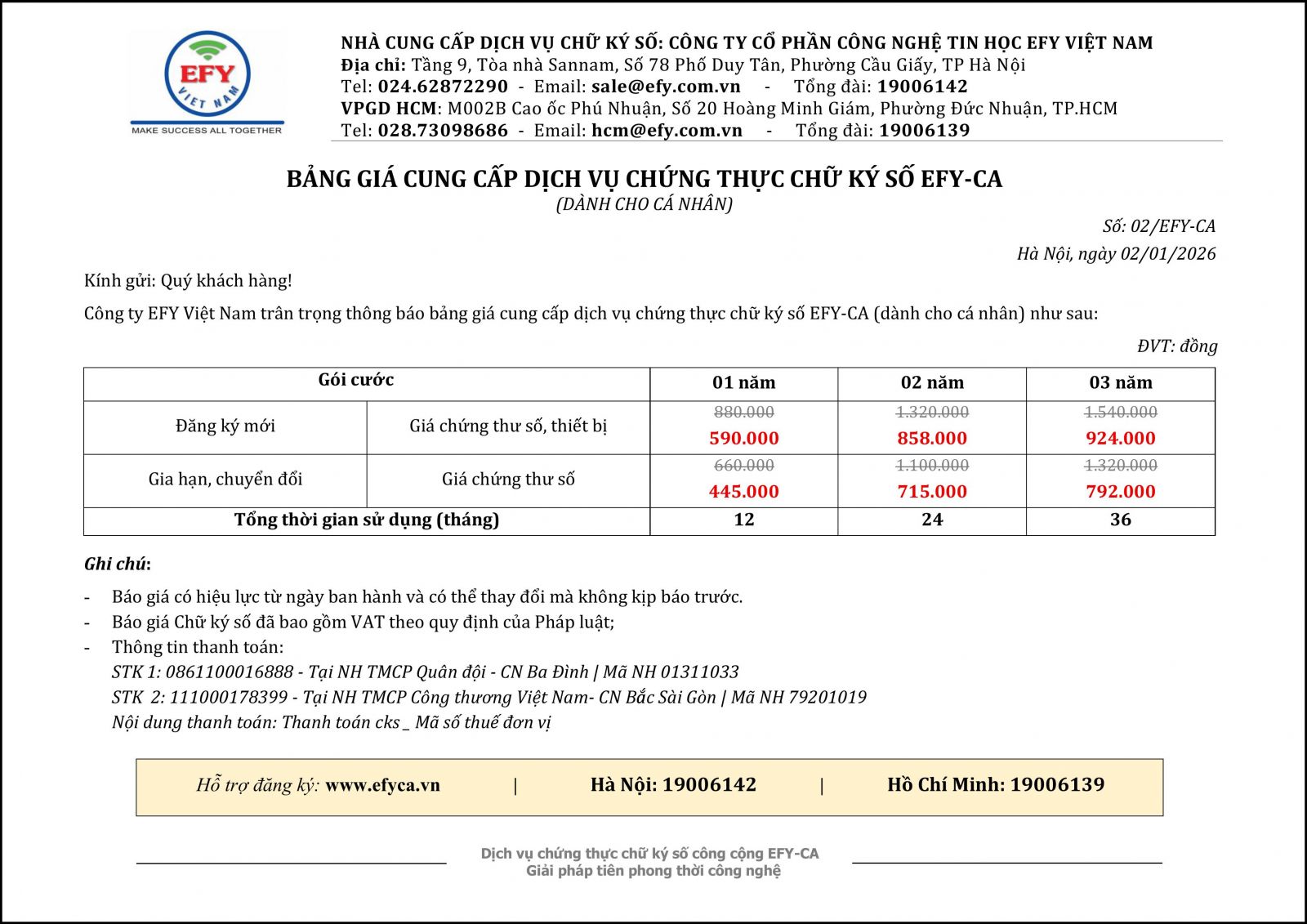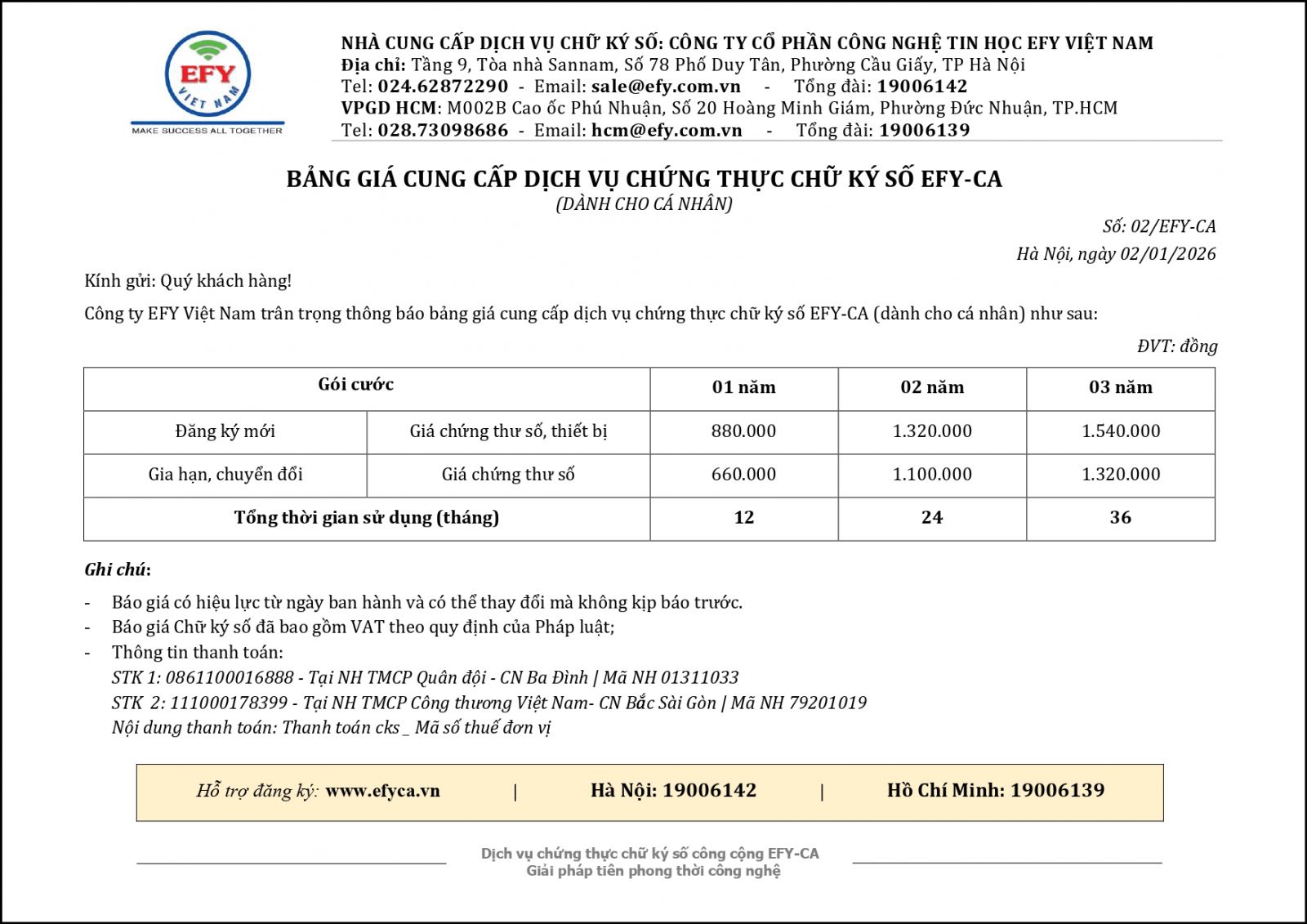EFY Việt Nam trân trọng thông báo tới Quý khách hàng bảng giá các loại chữ ký số EFY-CA sau đây: