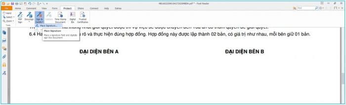 Bước 2: Tại giao diện Foxit Reader chọn [Protect] với chức năng [Sign&Certify] -> chọn [Place Signature …] để tiến hành ký vào văn bản.