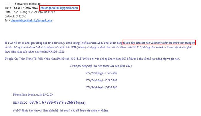 Trong thời gian gần đây, EFY Việt Nam nhận được rất nhiều phản ánh của khác hàng về việc khách hàng nhận được các cuộc gọi, email giả mạo EFY Việt Nam với các nội dung: Thông báo chữ ký số hết hạn; chữ ký số bị lỗi; chữ ký số thuộc diện cần nâng cấp đề phù hợp với hệ thống Thuế, BHXH, Hải quan; thu hồi Token; khóa mã Pin…. kèm theo là báo giá gia hạn, đăng ký mới chứng thư số nhằm lừa đảo và làm giảm uy tín của dịch vụ chữ ký số công cộng EFY-CA từ một số địa chỉ email như: chukyso01.hoadondientu@gmail.com, duc.cks.ca@gmail.com, ketoan@tqdesign.vn, quanlykhuvuc2@gmail.com, kimanhbt86@gmail.com, companyefy1@gmail.com, hotrothue.haiquan@gmail.com, linhnh@ihtkkvietnam.vn, phamduongvan.86@gmail.com, thuedientu595@gmail.com, hotrothue.haiquan@gmail.com, companyefy1@gmail.com, htkk.namca09@gmail.com, chukyso.khaithuedintu@gmail.com, ancks001@gmail.com, hotrokekhai.888@gmail.com, khuvuc15@gmail.com, phuonghoa9001@gmail.com, Thue011992@gmail.com, hotro383@gmail.com…