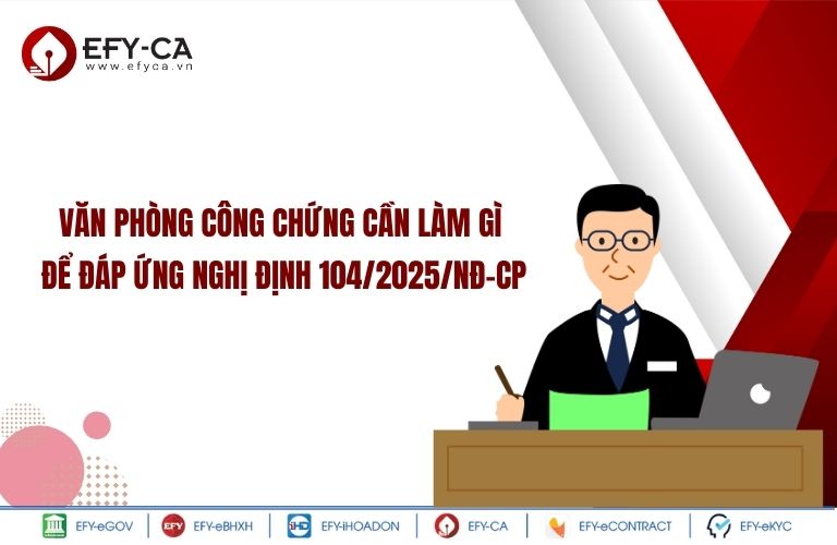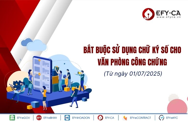 Theo nghị định 104/2025/NĐ-CP quy định từ ngày 01/07/2025, tất cả tổ chức hành nghề công chứng phải triển khai sử dụng chữ ký số để ký phê duyệt hồ sơ công chứng. Dưới đây là thông tin chi tiết về quy định bắt buộc sử dụng chữ ký số cho văn phòng công chứng. Cùng EFY-CA tìm hiểu nhé.