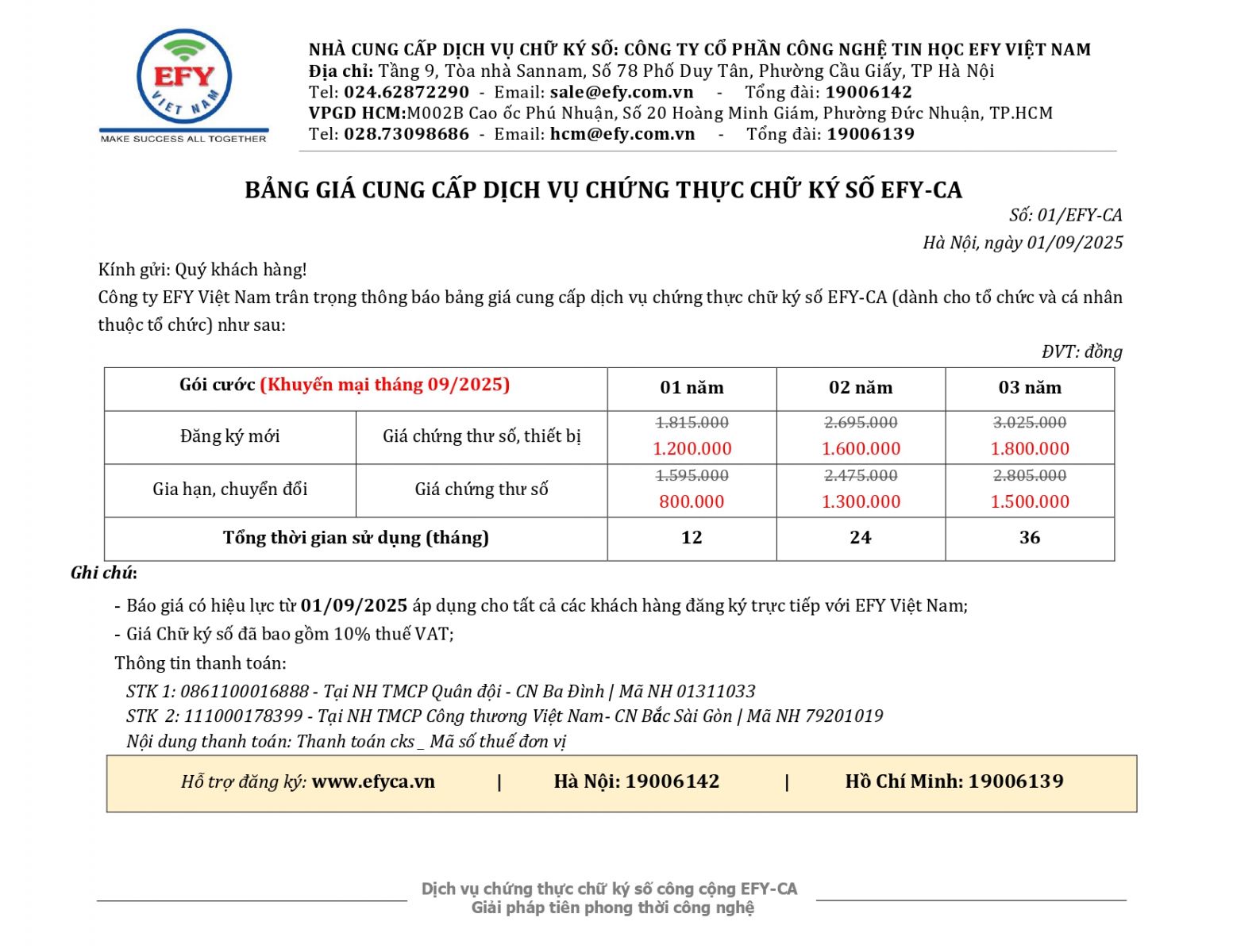 Bảng giá khuyến mại chữ ký số EFY-CA
