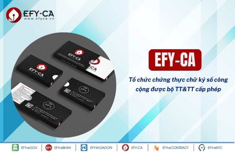 EFY Việt Nam là đơn vị cung cấp dịch vụ chứng thực chữ ký số công cộng EFY-CA hoạt động theo giấy phép số 381/GP-BTTTT do Bộ Thông tin và Truyền thông (Cấp phép lần đầu: Ngày 05/4/2018: Có giá trị đến hết ngày 04/4/2033).