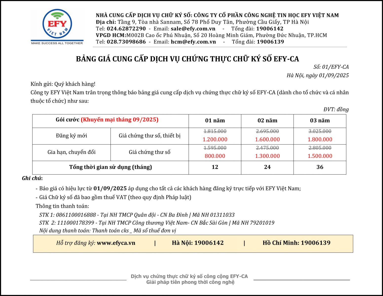 EFY-CA cung cấp nhiều gói dịch vụ chữ ký số từ gói 3 năm, 2 năm, 1 năm với mức giá cạnh tranh, phù hợp với mọi đối tượng khách hàng.